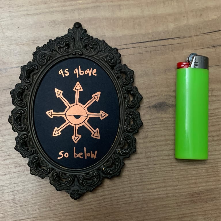 th symbol of Chaos Magick, an 8pointed star with th all-seeing eye in it's center. this is a design envisioned and created by th artist, iconic and visionary.