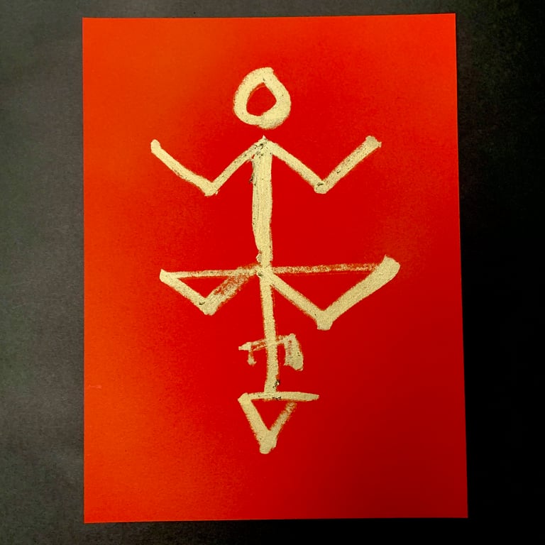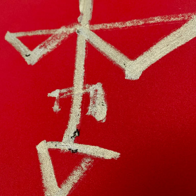 Crimson spray paint with a hand drawn Sigil in gold solid paint stick.
