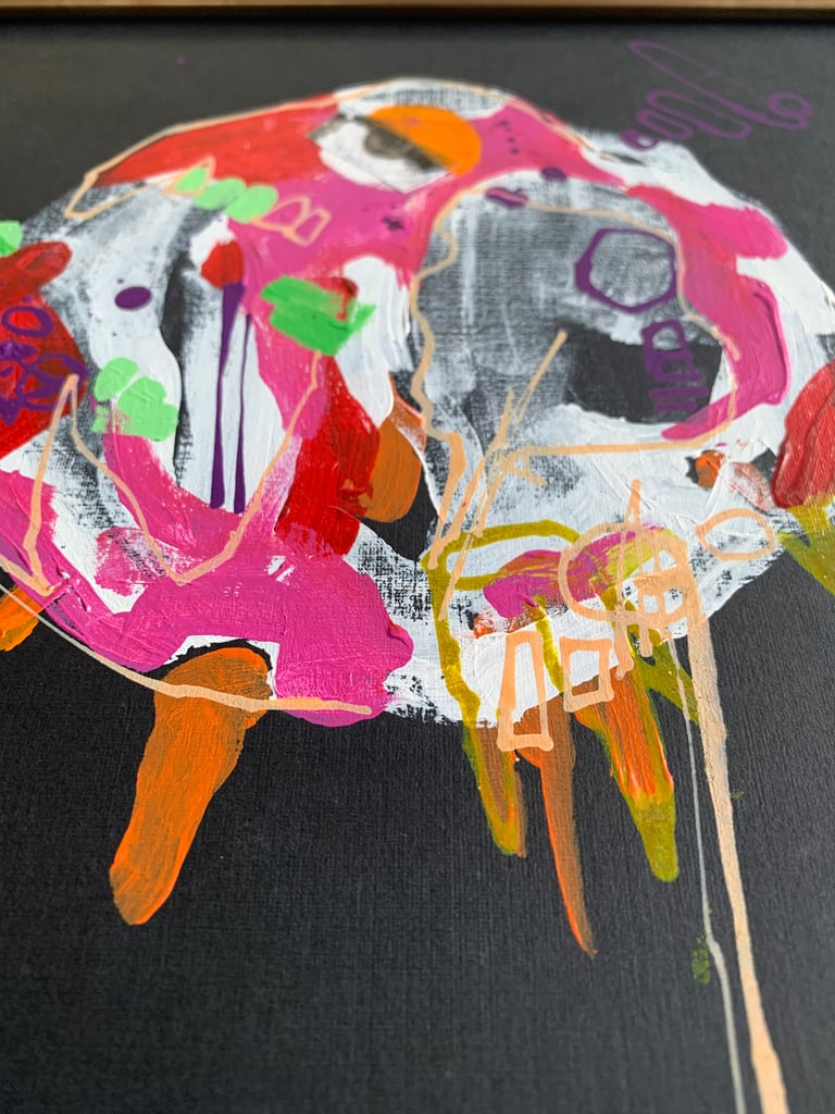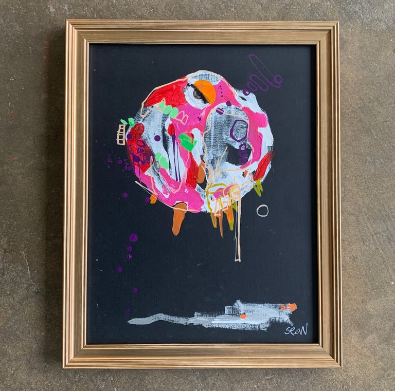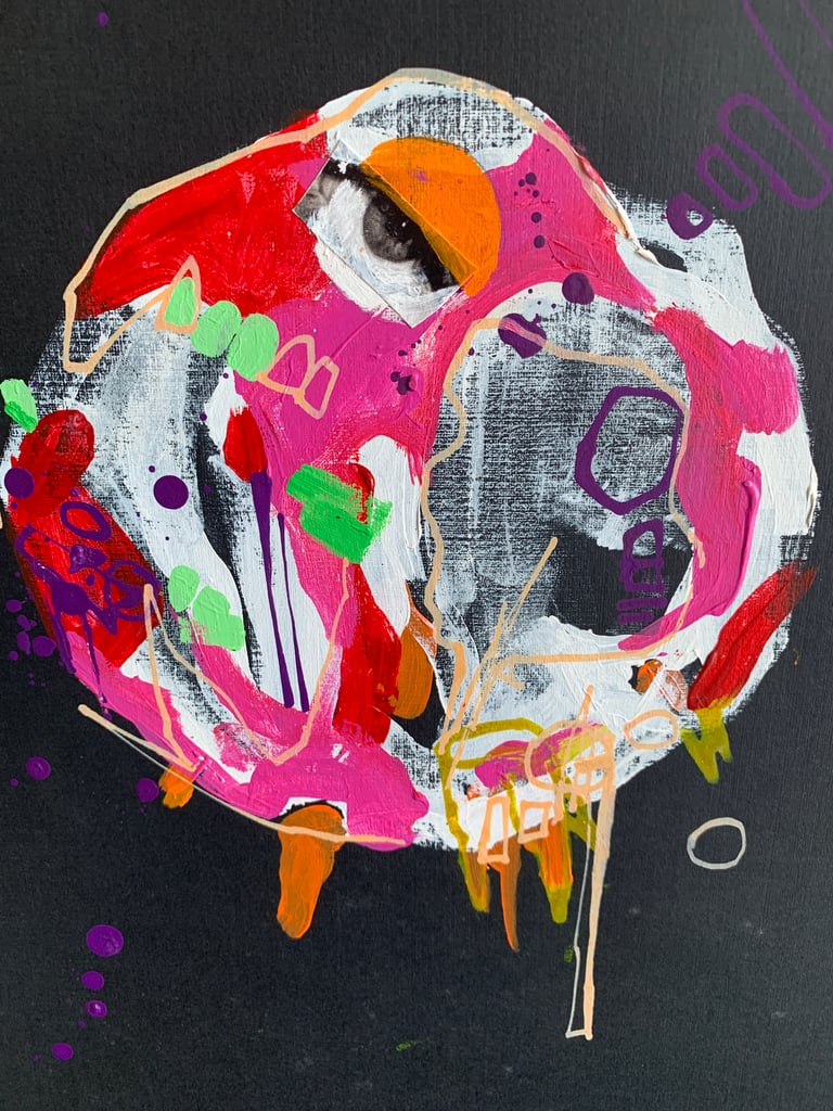 8.5 X 11 acrylic, ink and paper collage on black heavy stock.