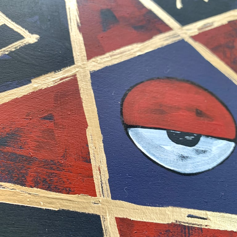 8” in diameter. acrylic, gold paint and raw ink on wood disk 3/4” thick.