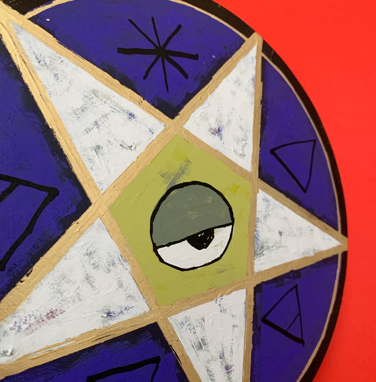 8” in diameter. acrylic, gold paint and raw ink on wood disk 1/2” thick with a bevelled edge. pentacle for use on your altar or magical work space, featuring th iconography for th 5elements; Earth, Air, Water, Fire, and Spirit. place yer intent in th center or upon a specific section for focused workings. this item is listed purposefully affordable, it is not sold for monetary gain, rather that th Great Work may be served.