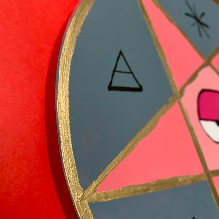 8” in diameter. acrylic, gold paint and raw ink on wood disk 3/4” thick.