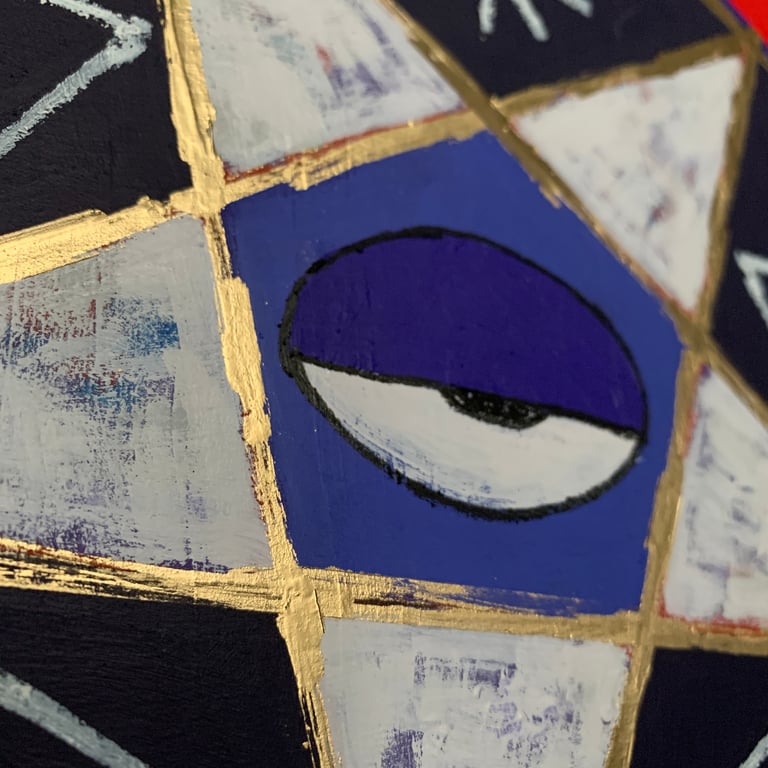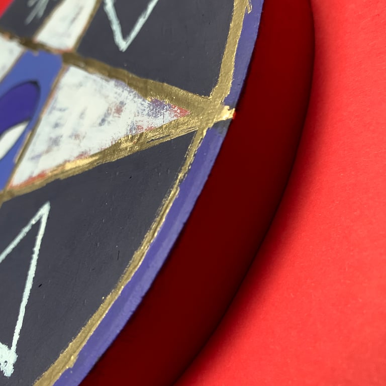 8” in diameter. acrylic, gold paint and raw ink on wood disk 3/4” thick.