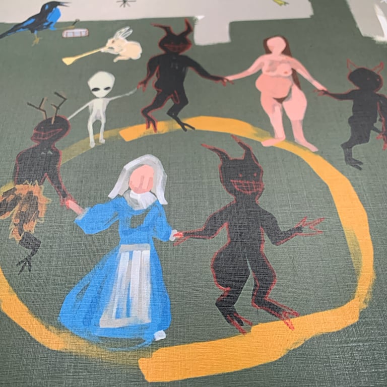 print is 10.5 X 13.5 oh! how embarrassing! an overexcited devil has broken th circle.